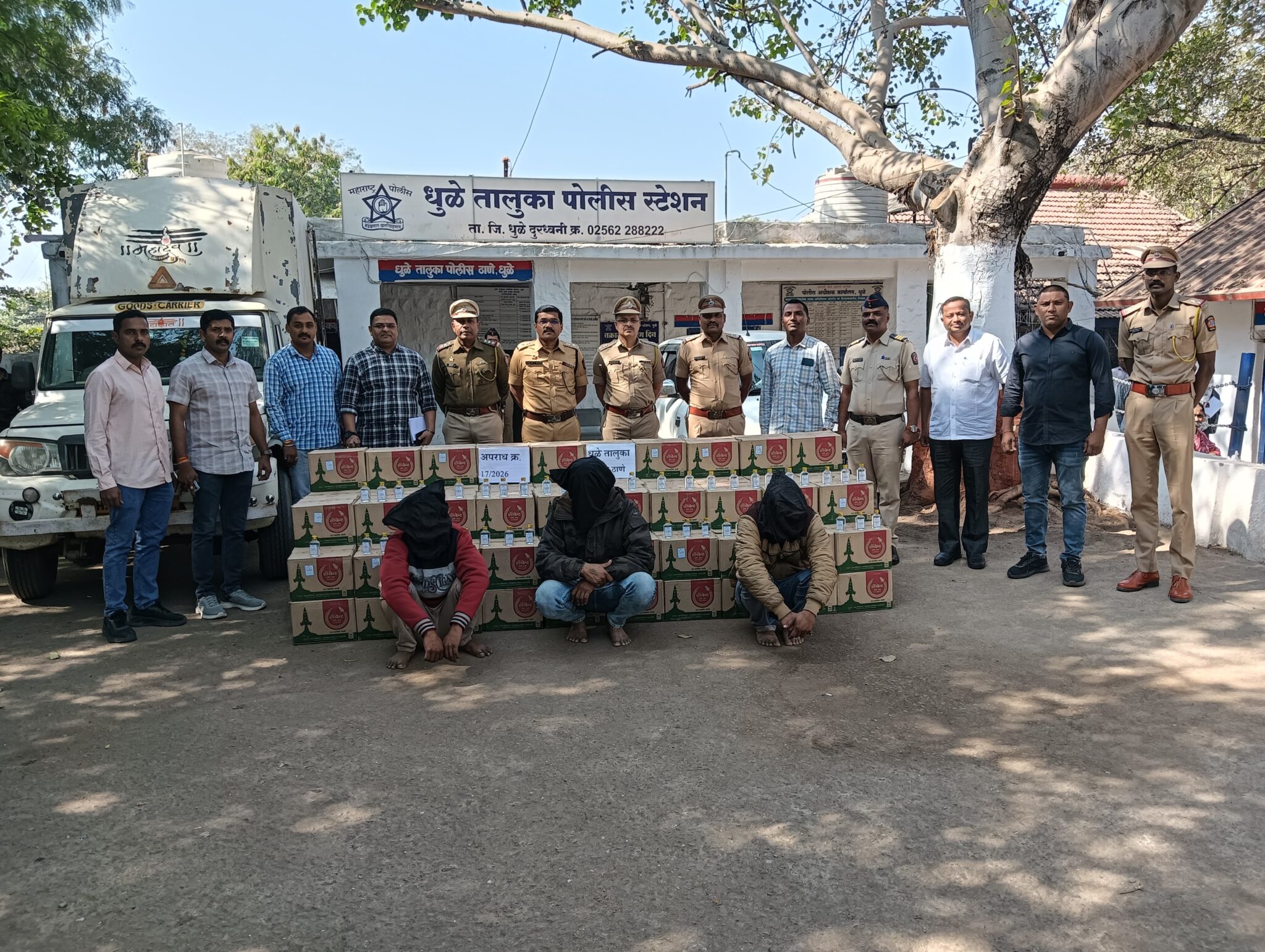 मध्यरात्री १:०० ते २:३६ च्या दरम्यान, संशयित ट्रक (MH 18 BA 8891) हॉटेलच्या आवारात उभा होता. अंधाराचा फायदा घेऊन ट्रकमधील दारूचे बॉक्स एका पिकअप वाहनात भरले जात असताना पोलिसांनी छापा टाकला. या छाप्यात पोलिसांनी खालील आरोपींना ताब्यात घेतले: १) राकेश छगनलाल जैन (वय ३५, रा. शांतीनगर, धुळे) २) दिपक अशोक शिंदे (वय ३५, रा. नत्थूबाबा नगर, मोहाडी, धुळे) ३) सुदाम भुरा गोसावी (वय ४२, रा. शिरपूर)