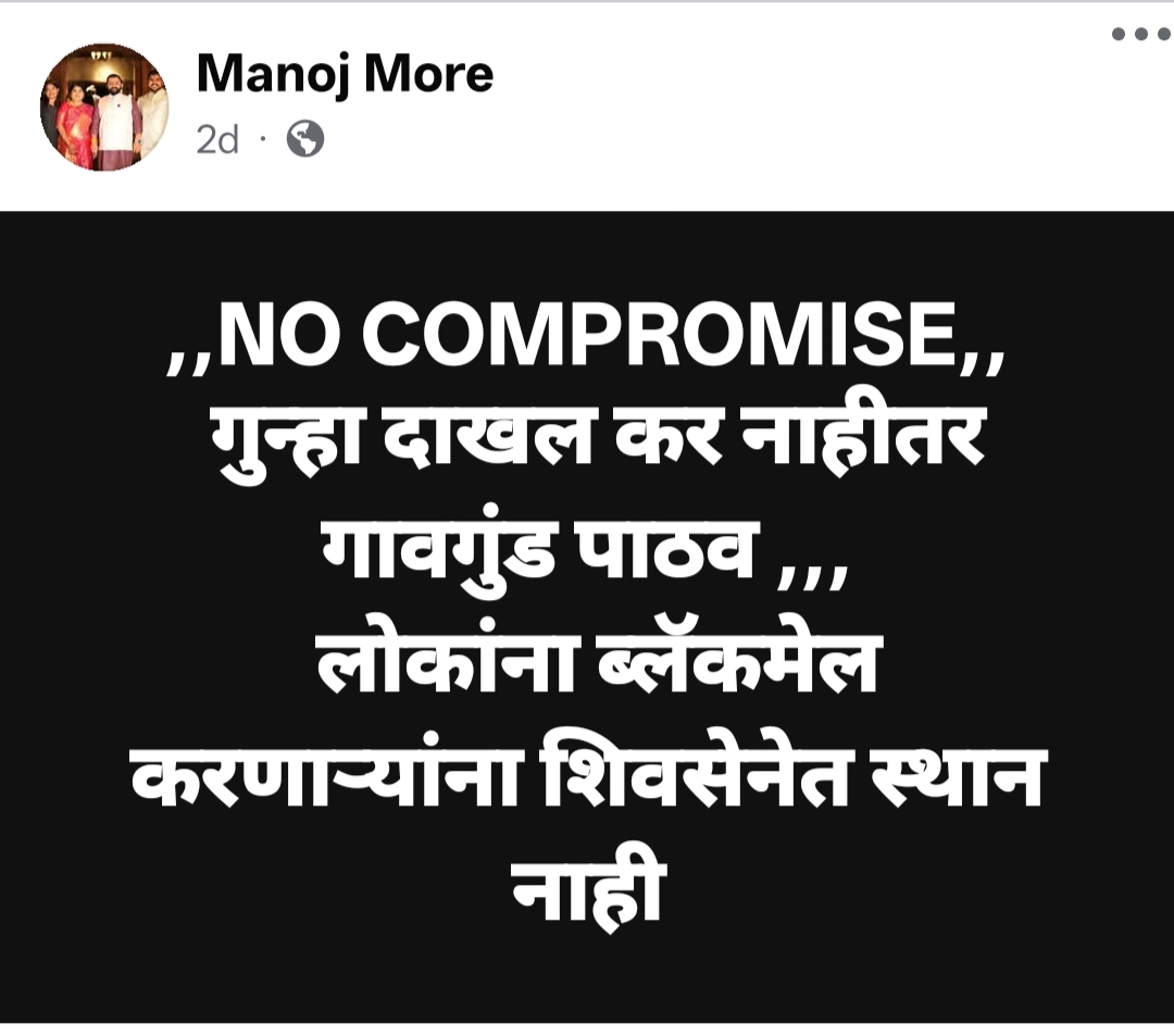 मनोज मोरेंची अजब पोस्ट ब्लॅकमेल व गाव गुंडांचा उल्लेख..!धुळे : अनेक दिवसापासून राजकारणात एकमेकांच्या विरोधात आगळ्या वेगळ्या प्रकारे भाष्य व मोठी भूमिका घेत आहेत कोण कुठल्या पातळीवर विरोधकांच्या मुसक्या आवळेल याचा नेम नाही परंतु शिंदे गटाचे मनोज मोरे हे नेहमी कुठल्या आणि कुठल्या ही विषयात चर्चेत असतात त्यांच्या अनेक सोशल मीडियाच्या पोस्टमुळे चर्चा होत असते अशीच दोन दिवसाआधी एक पोस्ट प्रचंड व्हायरल झाली आहे त्यात मनोज मोरे यांनी असे लिहिले आहे की “NO COMPROMISE” गुन्हा दाखल कर नाहीतर गावगुंड पाठव ” लोकांना ब्लॅकमेल करणाऱ्यांना शिवसेनेत स्थान नाही” अशाप्रकारे व्हायरल होत आहे त्यामुळे प्रचंड चर्चाही सुरू आहे नेमकं ही पोस्ट कोणासाठी याचे अनेक अर्थ देखील निघत आहेत ब्लॅकमेल करणारे कोण..? व गावगुंड पाठवणारे कोण..? त्यामुळे लवकरच राजकारणात मोठा रंग येण्याची चर्चा.