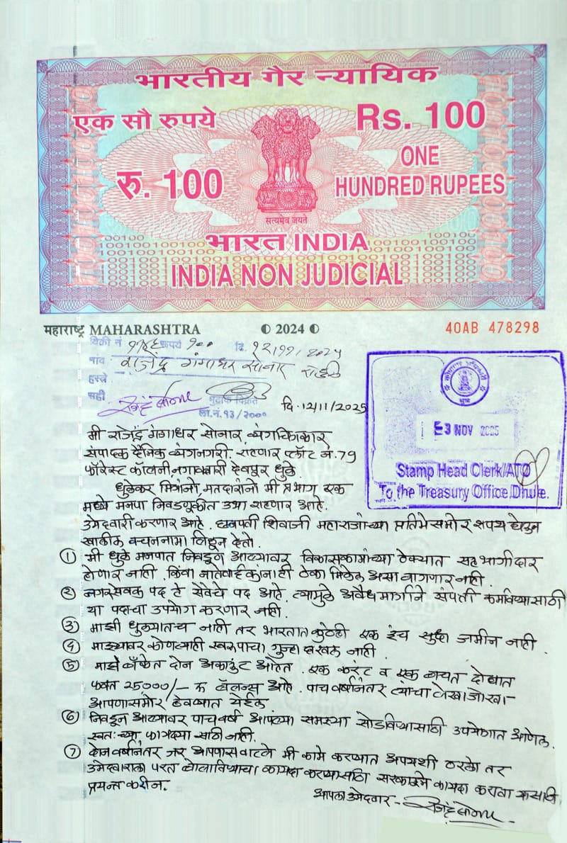 धुळे : धुळ्यातील ज्येष्ठ पत्रकार राजेंद्र सोनार हे निवडणुकीच्या रिंगणात उतरले आहेत मतदारांनी त्यांच्यावर विश्वास ठेवून मतदान करावे यासाठी चक्क 100 च्या स्टॅम्पवर स्वतःची हमी लिहून दिली आहे त्यात धुळेकर जनतेसाठी अपेक्षित असलेल्या मागण्या पूर्ण करतील असे स्टॅम्प पेपर वर लिहिले आहे.