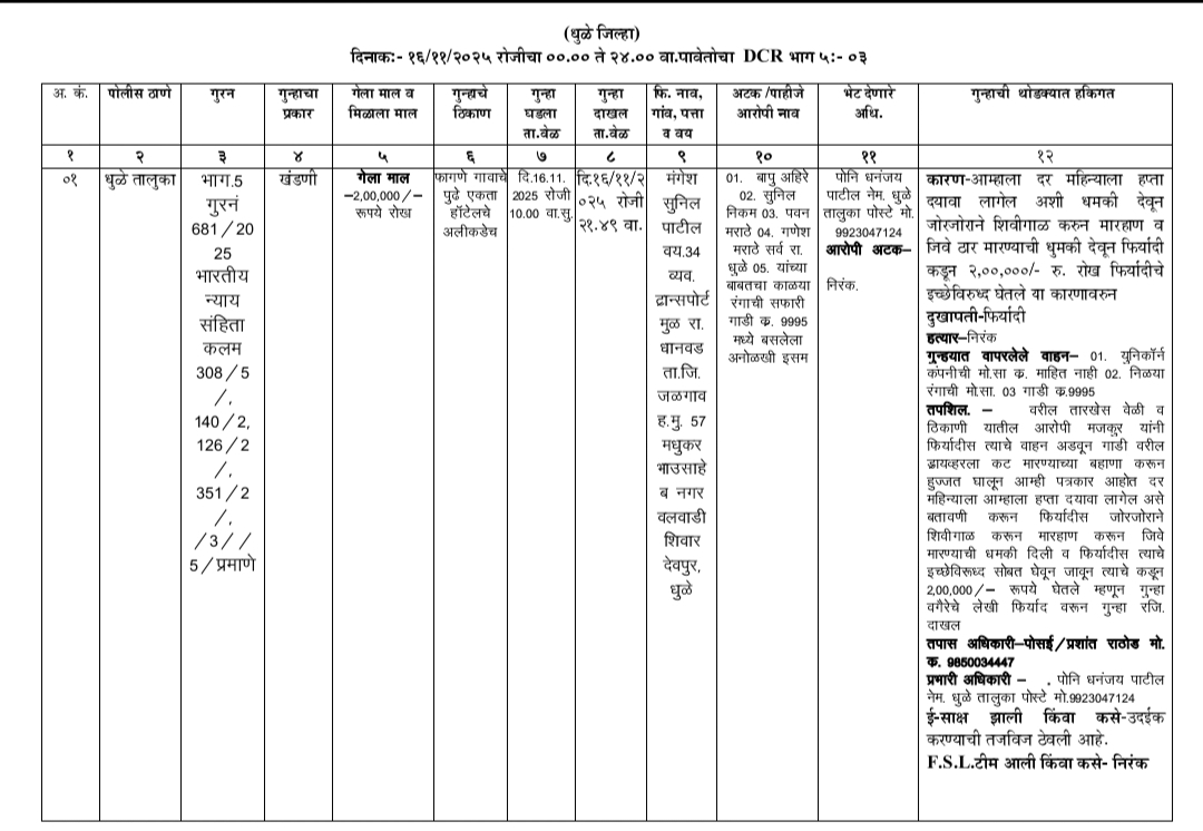 पीडित तक्रारदार यांनी अशी फिर्याद दिली आहे की आमचा ट्रान्सपोर्ट ट्रक फागणे या मार्गाने जात असताना की गणेश मराठे, पवन मराठे, सुनील निकम, बाप्पू अहिरे यांनी गाडीला कट मारण्याच्या बहाना करून हूज्जत घालून आम्ही पत्रकार आहोत दर महिन्याला आम्हाला हप्ता द्यावा लागेल अशी धमकी दिली व शिवीगाळ करून मारण्याची धमकी देखील दिली व सोबत असलेले दोन लाख रुपये हडप करण्याचे सांगण्यात येत आहे चार आरोपींचे नाव समोर आले असून 9995 नंबर च्या काळा रंगाच्या गाडीत असलेला पाचवा आरोपी हा मुख्य असल्याचा संशय आहे सदर आरोपींवर FIR NO 681/2025 नुसार BNS कलम 308/305,140/2,126/2,351/2/3 अशा कलमानुसार गुन्हा दाखल झाला आहे पुढील तपास तालुका पोलीस स्टेशन हे करीत आहे.