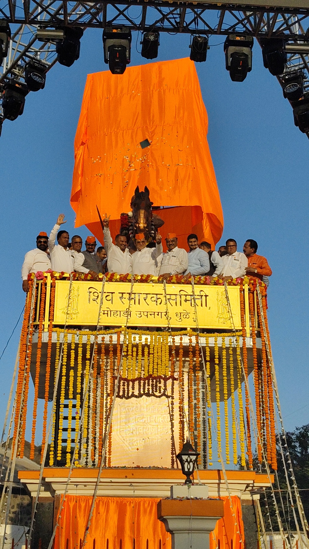 धुळे महानगरातील मोहाडी उपनगरात माजी नगरसेवक राजू पवार, प्रवीण पवार आणि छत्रपती शिवाजी महाराज स्मारक समितीचे अथक परिश्रम आणि सर्व आवश्यक परवानग्या घेऊन शासनाकडे सातत्याने पाठपुरावा करून अत्यंत रुबाबदार असा अश्वारूढ पुतळा उभारण्यात आला आहे. या पुतळ्याचे राज्याचे पणन व राजशिष्टाचार मंत्री जयकुमार रावल यांच्या हस्ते दिनांक 15 डिसेंबर रोजी शानदार उद्घाटन करण्यात आले. या दिमाखदार सोहळ्याला आ. अनुप अग्रवाल, माजी केंद्रीय राज्यमंत्री डॉक्टर सुभाष भामरे, आ. राम भदाणे, माजी नगरसेवक राजू पवार, प्रवीण पवार, भाजपा महानगरप्रमुख गजेंद्र अंपळकर, ग्रामीण जिल्हाध्यक्ष बापू खलाणे, माजी महापौर प्रदीप कर्पे, प्रतिभा चौधरी, चंद्रकांत सोनार, जयश्री अहिरराव, डॉ. सुशील महाजन, डॉ. माधुरी बाफना, नारायण पाटील, ललित माळी यांच्यासह छत्रपती शिवाजी महाराज स्मारक समितीचे पदाधिकारी, भाजपा नेते, कार्यकर्ते व नागरिक मोठ्या संख्येने उपस्थित होते.